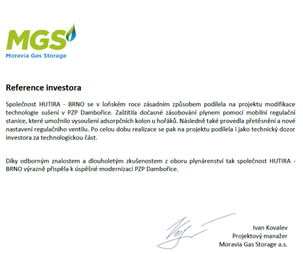 Last year, HUTIRA – BRNO participated in a number of major projects. One of them was the modification of the drying technology in the underground natural gas storage tank in Dambořice (UGS Dambořice), which is operated by Moravia Gas Storage.