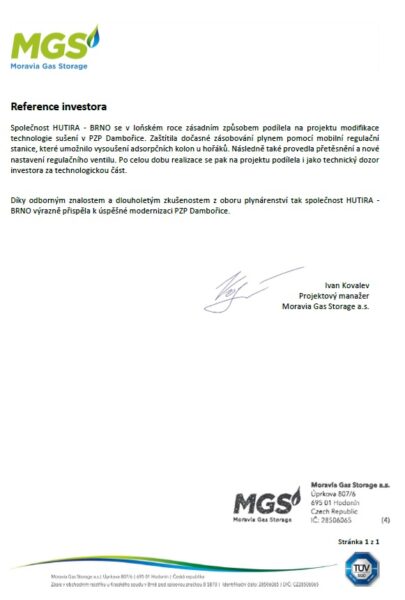 Last year, HUTIRA – BRNO participated in a number of major projects. One of them was the modification of the drying technology in the underground natural gas storage tank in Dambořice (UGS Dambořice), which is operated by Moravia Gas Storage.